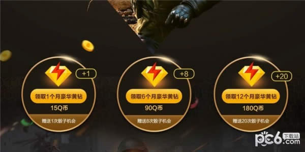2.活动期间:在本页面15Q币购买1个月豪华黄钻即可获得一个骰子,90Q币购买6个月豪华黄钻即可获得8个骰子,180Q币购买12个月豪华黄钻即可获得20个骰子,每点击1次抽奖,消耗1个骰子