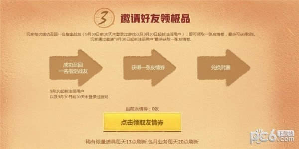2.玩家每次成功召回一名指定战友(9月30日前30天未登录过游戏以及9月30日起新注册用户),即可领取一张友情卷,最多可获得5张。玩家通过邀请“9月30日起新注册用户”最多获取一张友情卷。