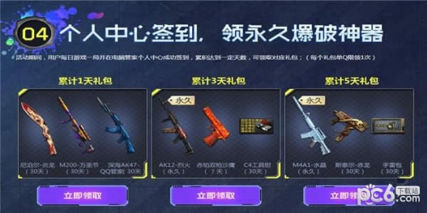 4.活动期间,用户每日游戏一局并在电脑管家个人中心成功签到,累积达到一定天数,可领取对应礼包;(每个礼包单Q限领1次)