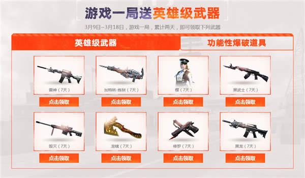3月9日~3月18日,游戏一局,累计两天,即可领取下列武器