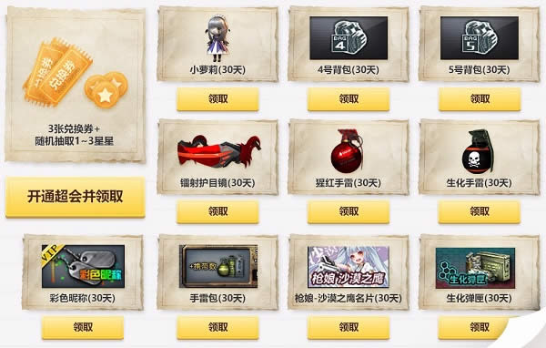 活动期间:在本页面单次开通一个月超级会员即可获得3张兑换券+随机抽取1~3星星,消耗一张兑换券即可在右侧兑换相应道具,累计对应积分在下方兑换道具,单Q限3次