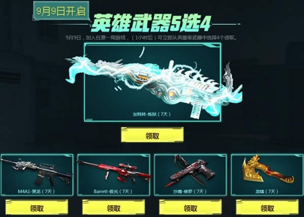 9月9日,加入任意一局游戏,(1小时后)可立即从英雄级武器中选择4个领取。