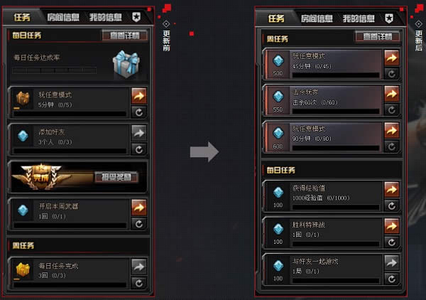 游戏大厅的左侧任务栏中,之前的每日任务、连续任务和全部达成奖励将全部删除,改为全新的单一任务形式,每周共提供6种任务,其中包括3种每周任务和3种每日任务。