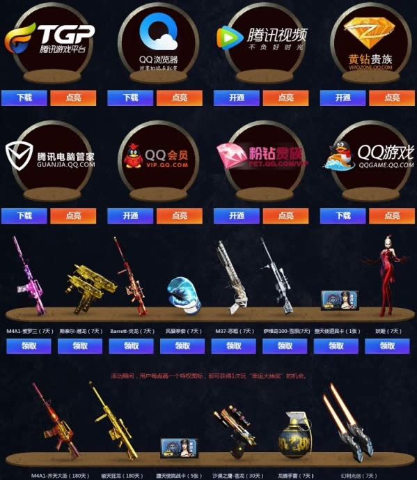 活动期间,用户每点亮一个特权图标,即可领取1件装备,每件装备最多领取1次。