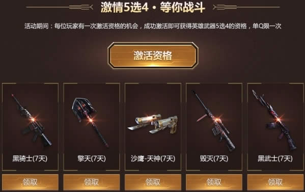 活动期间,每一位玩家有一次激活资格的机会,成功激活即可获得英雄武器5选4的资格,单Q限一次