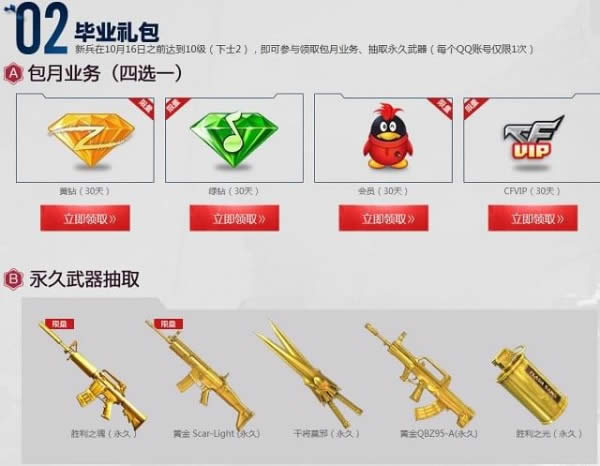 新兵在10月16日之前达到10级(下士2),即可参与领取包月业务、抽取永久武器(每个QQ账号仅限1次)