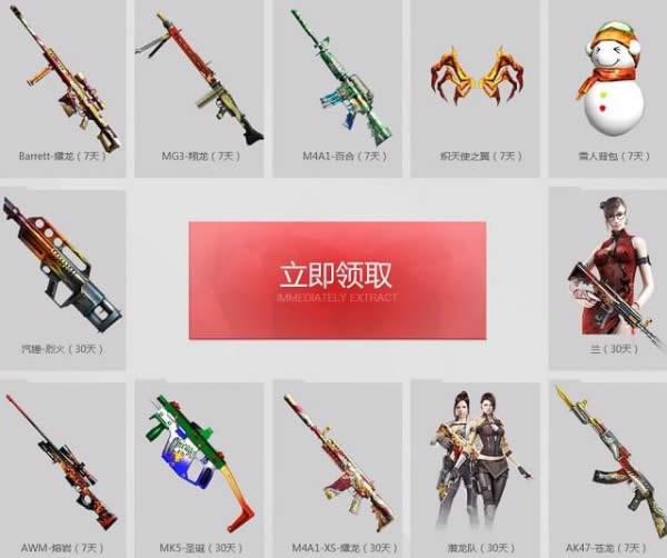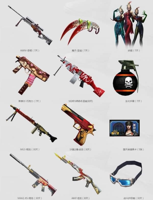 胜利之魄(7天)黄金充气大锤(7天)黄金加特林(30天)黄金M4A1-X(30天)疾火-流星(30天)黄金AWM(30天)