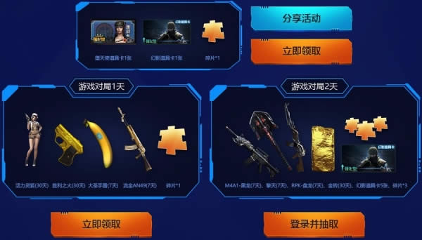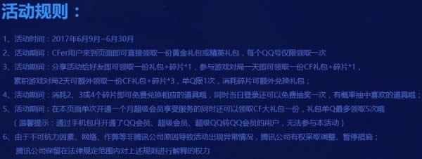 活动期间:分享活动到空间即可领取一份礼包+碎片*1,参与到游戏盒对局一天即可领取一份CF礼包+碎片*1,累计游戏对局2天可额外领取一份CF礼包+碎片*3,单Q限1次,消耗碎片可额外兑换礼包