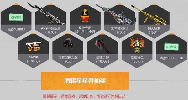 ⑤活动期间:8月成功开通的用户的CFer同时9月再次开通即可领取兑换券*2,消耗对应数量的星星即可在下方兑换相应的道具哦,每份礼包单Q限2次,游戏奖励请进入仓库查看!
