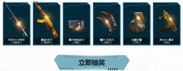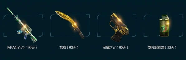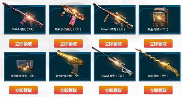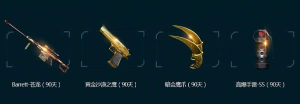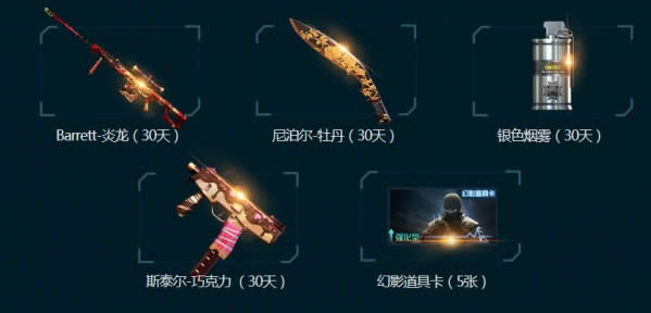 激光短刃-巧克力(7天)、AWM-A-彩虹(7天)、猎鹰OP99-涂鸦(7天)、SR3M-涂鸦(7天)、兰(30天)