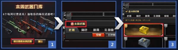 周免“武器宝箱”自动存入玩家仓库, 您可以通过个人仓库 “本周武器”按钮,点击快速找出周免“武器宝箱”。(本周首次上线的时间是5月1日早6:00)