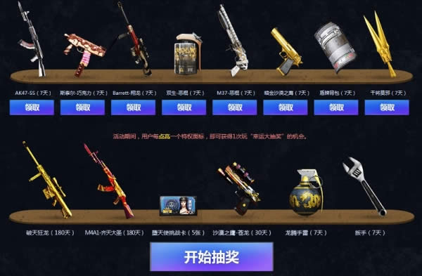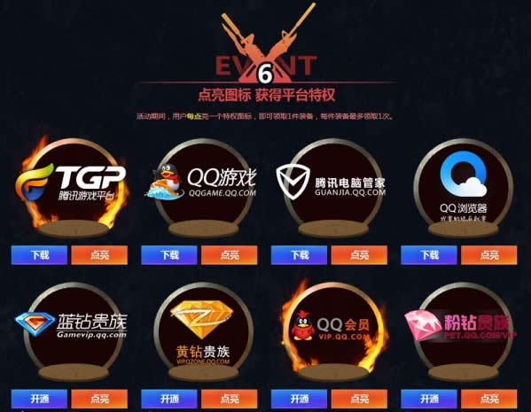活动期间,用户每点亮一个特权图标,即可领取1件装备,每件装备最多领取1次。