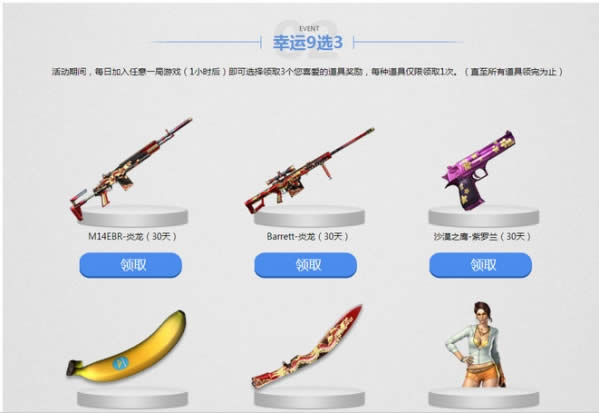 活动期间,每日加入任意一局游戏(1小时后),即可选择领取三个您喜爱的道具奖励,每种道具仅限领取一次。(直到所有道具领完为止)