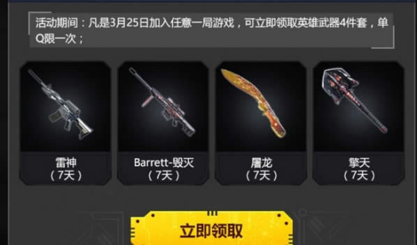 活动期间:凡是3月25日加入任意一局游戏,可立即领取英雄武器四件套,单Q限一次;