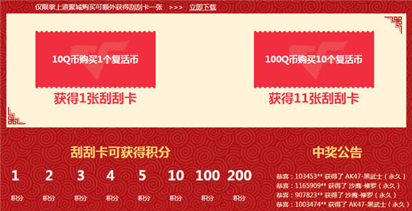 2017年CF穿越火线新年刮刮卡活动正式开启了!活动期间,玩家登陆cf新年刮刮卡活动网站购买1个复活币即可获得1张刮刮卡,使用刮刮卡即可参与永久英雄武器抽奖!即便没有抽到英雄武器也可用刮刮卡积分兑换哦!还在等什么?赶快来参加2017年cf新年刮刮卡活动吧!
