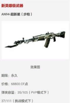 cfAn94超新星值得买吗?an94本身性能就不错变成英雄武器后还要优化改良,绝对的强力!在挑战模式看起来也有吊炸天的属性,下面我们就来看一看cfAn94超新星性能介绍一览,希望对各位有所参考。
