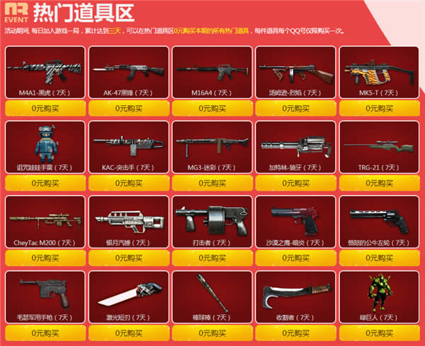 活动期间, 每日加入游戏一局,累计达到三天,可以在热门道具区0元购买本期的所有热门道具,每件道具每个QQ号仅限购买一次。