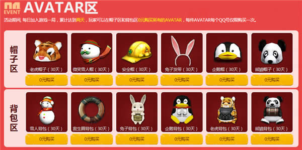 活动期间, 每日加入游戏一局,累计达到两天,玩家可以在帽子区和背包区0元购买所有的AVATAR,每件AVATAR每个QQ号仅限购买一次。