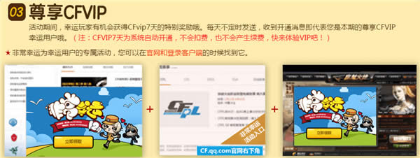 活动期间,幸运玩家有机会获得CFvip7天的特别奖励哦。每天不定时发送,收到开通消息即代表您是本期的尊享CFVIP