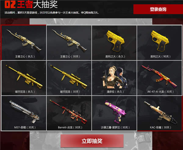 活动期间,累积3天登录游戏,次日可以免费参与一次王者大抽奖。单Q限抽取2次。