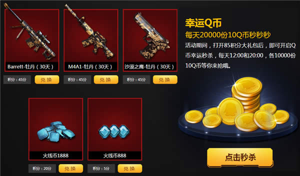 活动期间,打开85积分大礼包后,即可开启Q币幸运秒杀,每天12:00和20:00,各10000份10Q币等你来抢哦。
