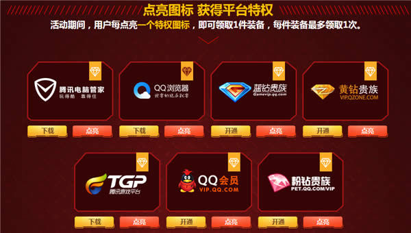 活动期间,用户每点亮一个特权图标,即可领取1件装备,每件装备最多领取1次。
