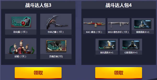 活动期间,加入任意游戏一局,可以从4份战斗礼包中选择1份领取。10月29日、10月30日,加入任意游戏一局,可再从4份战斗礼包中选择2份领取。可累计领取3份战斗礼包。(每个礼包单Q限领取1次)