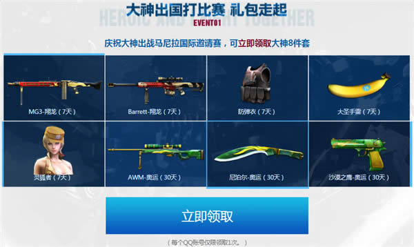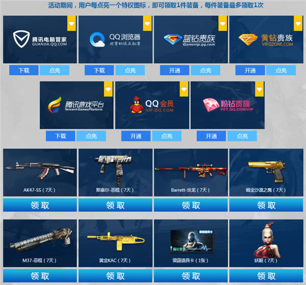 活动期间,用户每点亮一个特权图标,即可领取1件装备,每件装备最多领取1次