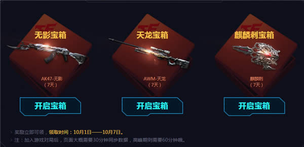2)9月30日-10月7日,每天加入任意一局游戏,(1小时后)可打开一个神枪宝箱。(每天限开一次,共8次)