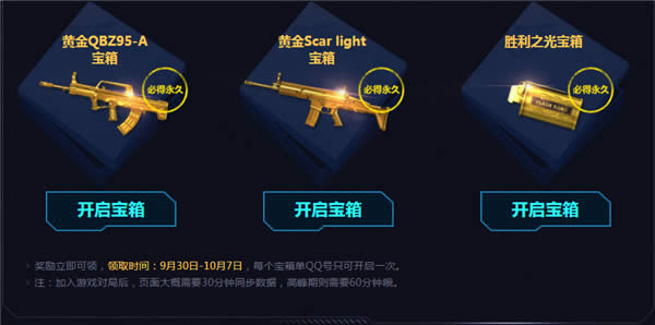 奖励立即可领,领取时间:9月30日-10月7日,每个宝箱单QQ号只可开启一次。