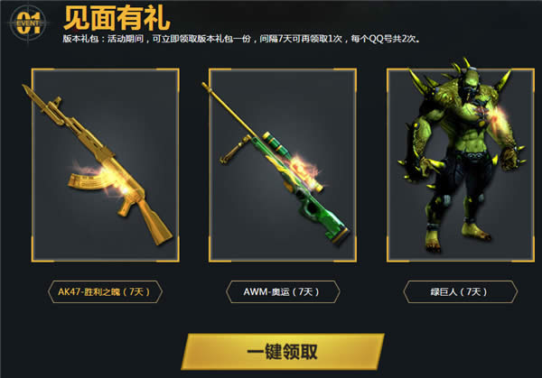 版本礼包:活动期间,可立即领取版本礼包一份,间隔7天可再领取1次,每个QQ号共2次。