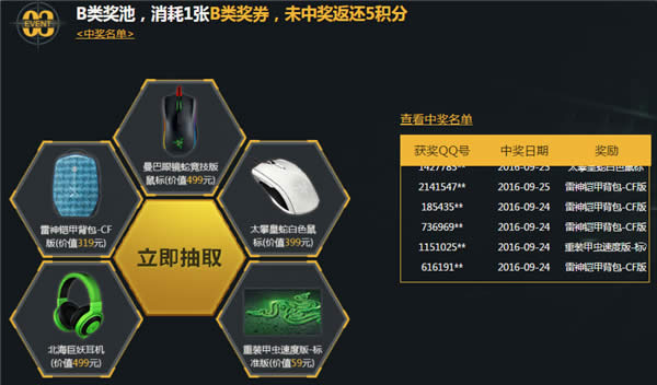 3)B类奖池,消耗1张B类奖券,未中奖返还5积分