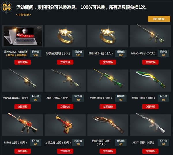4)活动期间,累积积分可兑换道具。100%可兑换,所有道具限兑换1次。