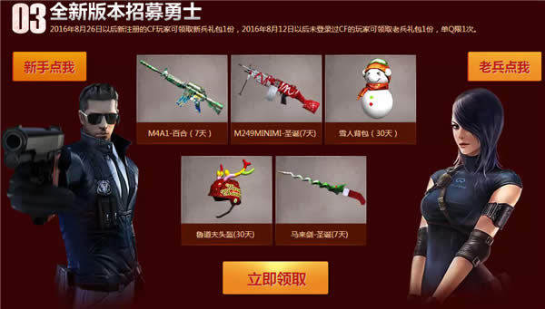 3、2016年8月26日以后新注册的CF玩家可领取新兵礼包1份,2016年8月12日以后未登录过CF的玩家可领取老兵礼包1份,单Q限1次;