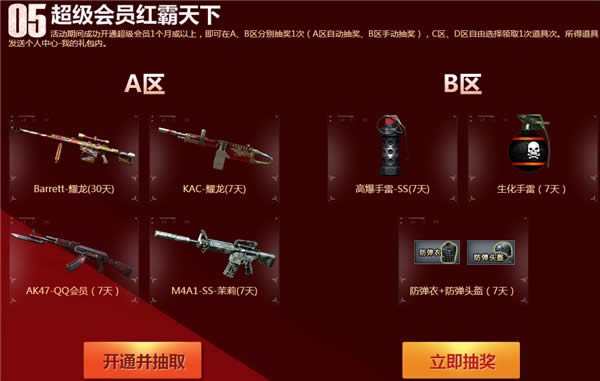 5、活动期间成功开通超级会员1个月或以上,可在A、B区分别抽奖1次(A区自动抽奖、B区手动抽奖),C区、D区分别自由选择领取1次道具。所得道具发送个人中心-我的礼包内;