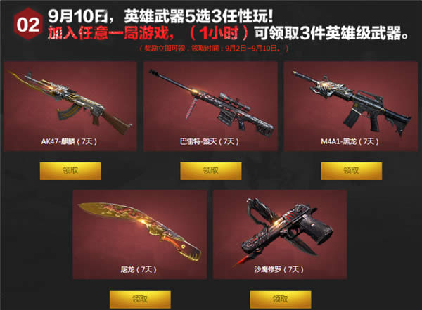 2)9月10日,英雄武器5选3任性玩!加入任意一局游戏,(1小时)可领取3件英雄级武器。