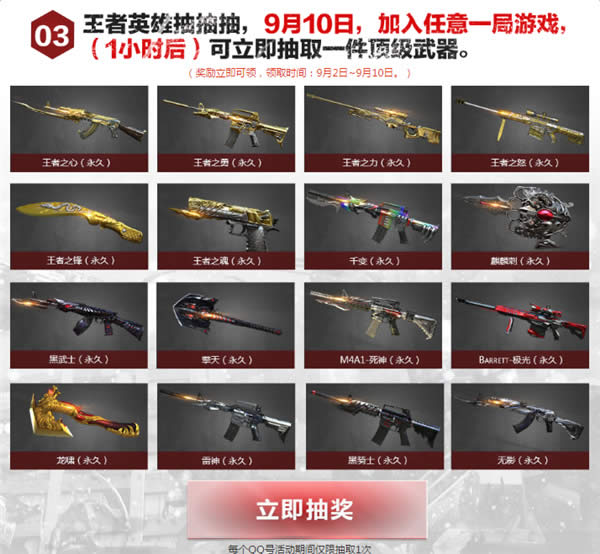 3)王者英雄抽抽抽,9月10日,加入任意一局游戏,(1小时后)可立即抽取一件顶级武器。