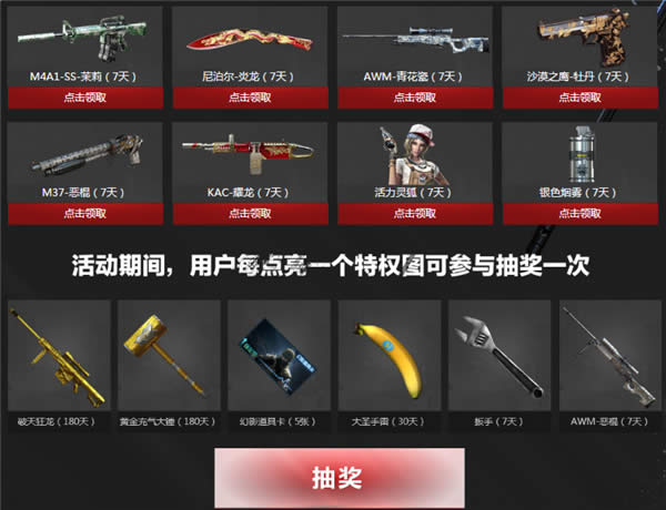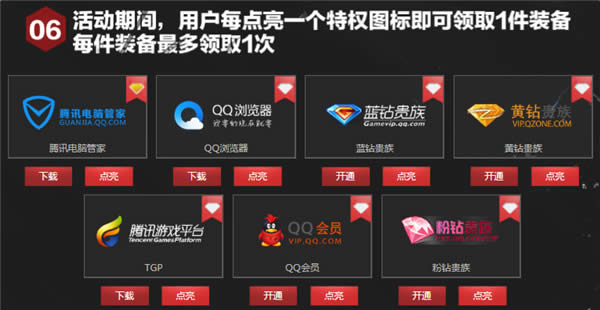6)活动期间,用户每点亮一个特权图标即可领取1件装备,每件装备最多领取1次