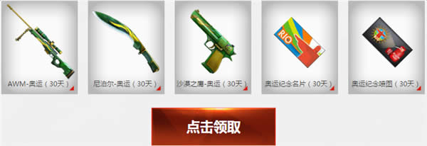 奥运狂欢季,披金斩银,战个痛快,加入任意一局游戏,(1小时后)立即可领奥运战斗礼6件套。每个QQ账号仅限领取1次。