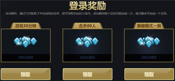 活动期间,通过TGP登录CF并完成相应任务,即可领取对应的火线币。活动期间每个任务仅能完成一次,每日最多可完成一个任务。