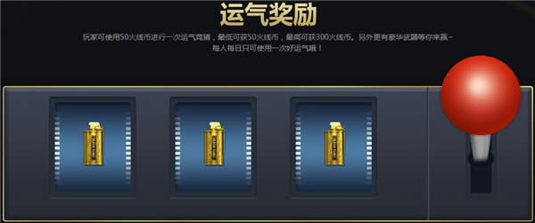 玩家可使用50火线币进行一次运气竞猜,最低可获50火线币,最高可获300火线币。另外更有豪华武器等你来赢~