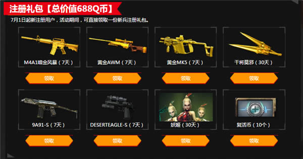 7月1日起新注册用户,活动期间,可直接领取一份新兵注册礼包。