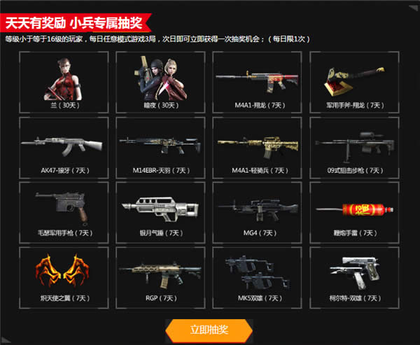 等级小于等于16级的玩家,每日任意模式游戏3局,次日即可立即获得一次抽奖机会;(每日限1次)