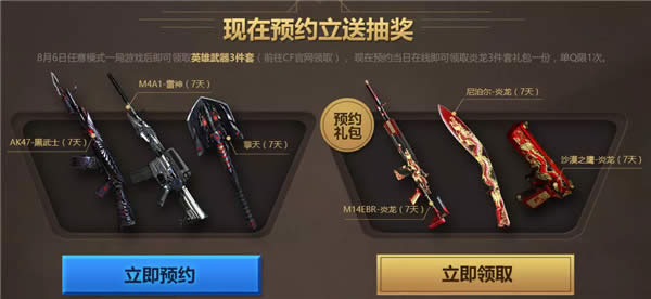 8月6入任意模式一局游戏后即可领取英雄武器3件套(前往CF官网领取),现在预约当日在线即可领取炎龙3件套礼包一份,单Q限1次。