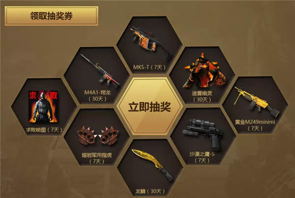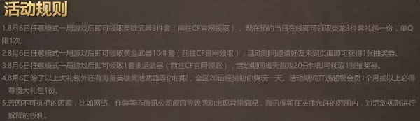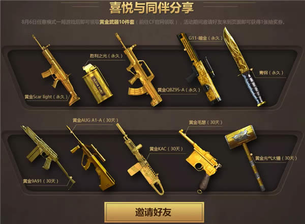 8月6日任意模式一局游戏后即可领取黄金武器10套(前往CF官网领取),活动期间邀请好友来到页面即可获得1张抽奖券。