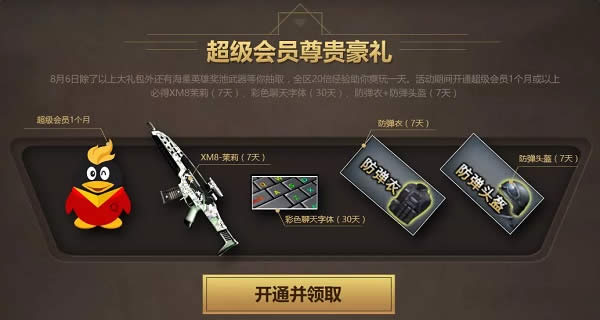 8月6日除了以上大礼包外还有海量英雄奖池武器等你抽取,全区20倍经验助你爽玩一天,活动期间开通超级会员1个月或以上必得XM8茉莉(7天)、彩色聊天字体(30天)、防弹衣+防弹头盔(7天)