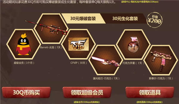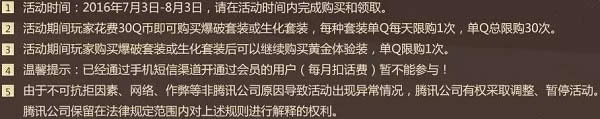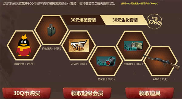 活动期间玩家花费30QB即可购买爆破套装或生化套装,每种套装单Q每天限购1次。