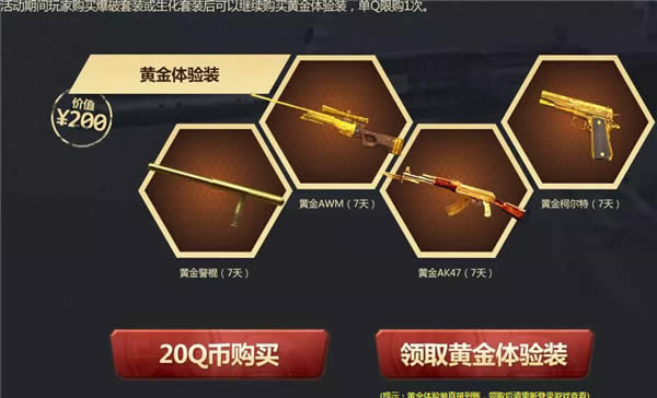活动期间玩家购买爆破套装或生化套装后可以继续购买黄金体验装,单Q限购1次。