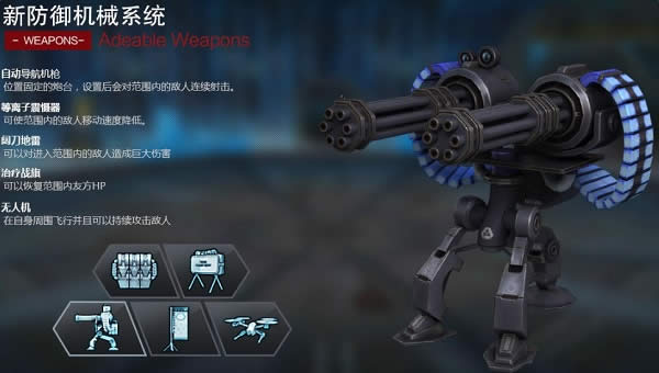 自动导航机枪:位置固定的炮台,设置后会对范围内的敌人持续射击。