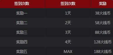 连续签到不可以间断,玩家连续签到将获得火线币奖励。下表为连续签到的奖励表。连续签到1、2、3、4天分别会获得同数额的火线币,4天后,连续签到会达到MAX状态,接下来每天登录都会获得MAX状态对应的火线币奖励。